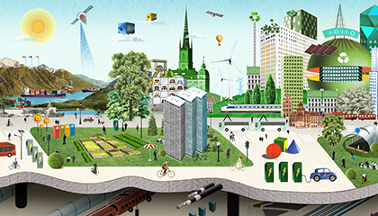 Energiproduktion från olika källor är nödvändiga i staden. Stora kraftverk utanför och små producenter inne i staden. Genom åren har standarder sett till att allt från kärnkraft till solenergi utvecklas effektivt och säkert.